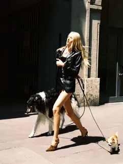 For the Pre-Fall 2025 campaign, the art direction, production, casting, and art buying were guided by a cohesive reflection of Blumarine’s effortlessly cool and grounded sense of reality. The shoot reimagines the simple act of dog walking as an exaggerated display of personal power, a scene about presence and control. The result carries a hint of humor, confidence, and quiet authority.